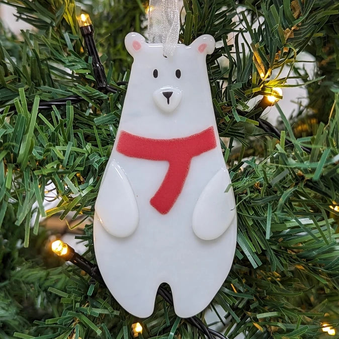 This delightful Christmas tree decoration features a charming white polar bear, crafted from fused glass and designed with its paws in front, wearing a vibrant red scarf. The bear is brought to life with cute hand-applied face detailing, adding a playful touch to this festive ornament.