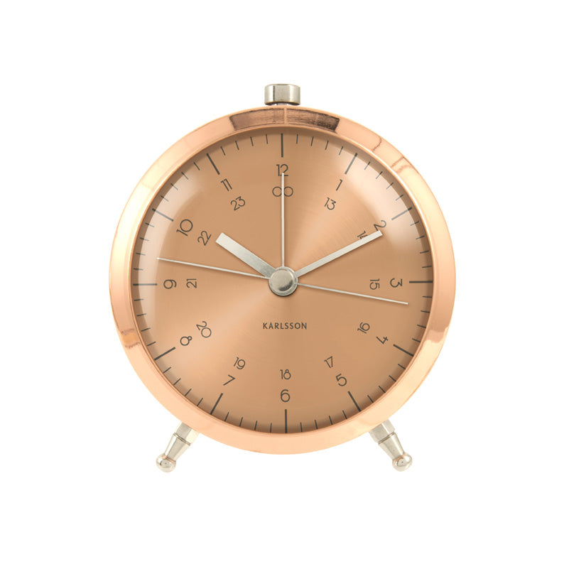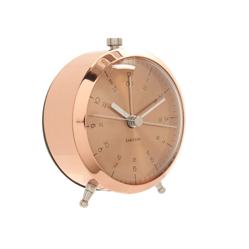 Tired of the digital world? Get back to basics with a classic alarm clock in a magnificent copper plated finish. The well-known round shape with two legs will bring back nostalgic memories and create a focal point on your bedside table. The dial offers a 12 and 24 hour clock marked in black with a set of contrasting white hands. A push button on top will turn off the alarm. A great gift. Size diameter 9cm, depth 5cm