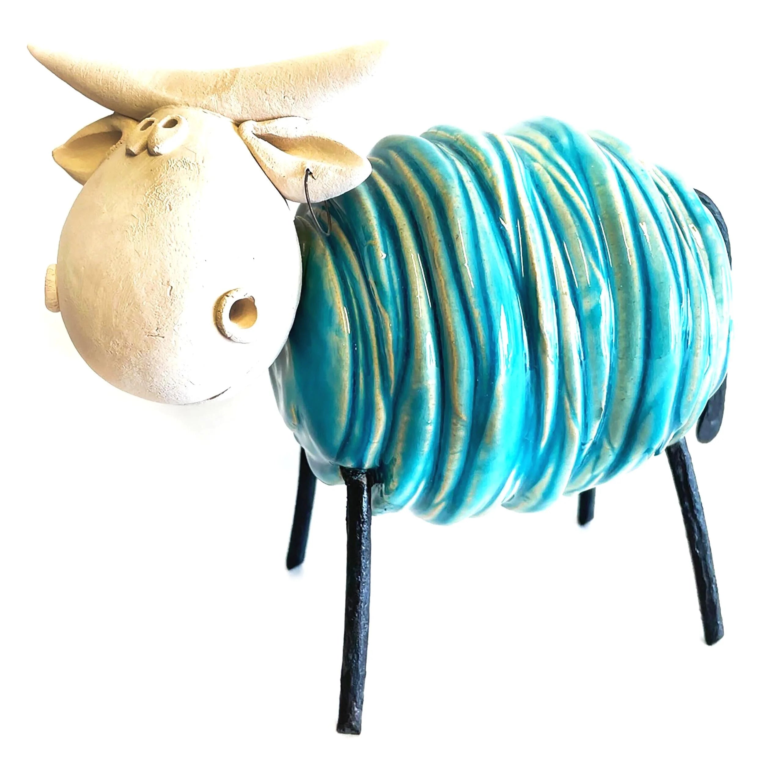 Handmade Ceramic Mint Green Cow Statue with Iron Legs and Ear Tag