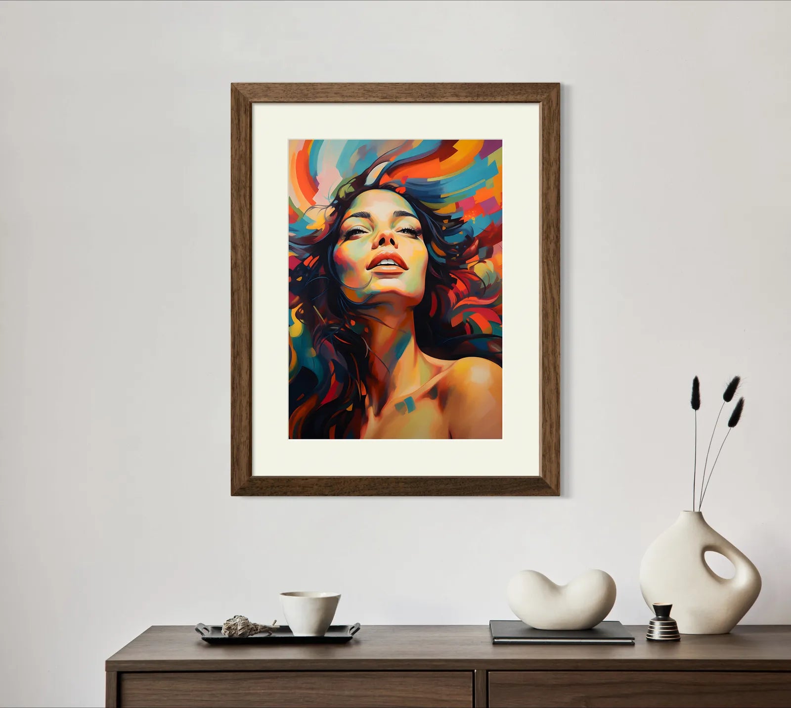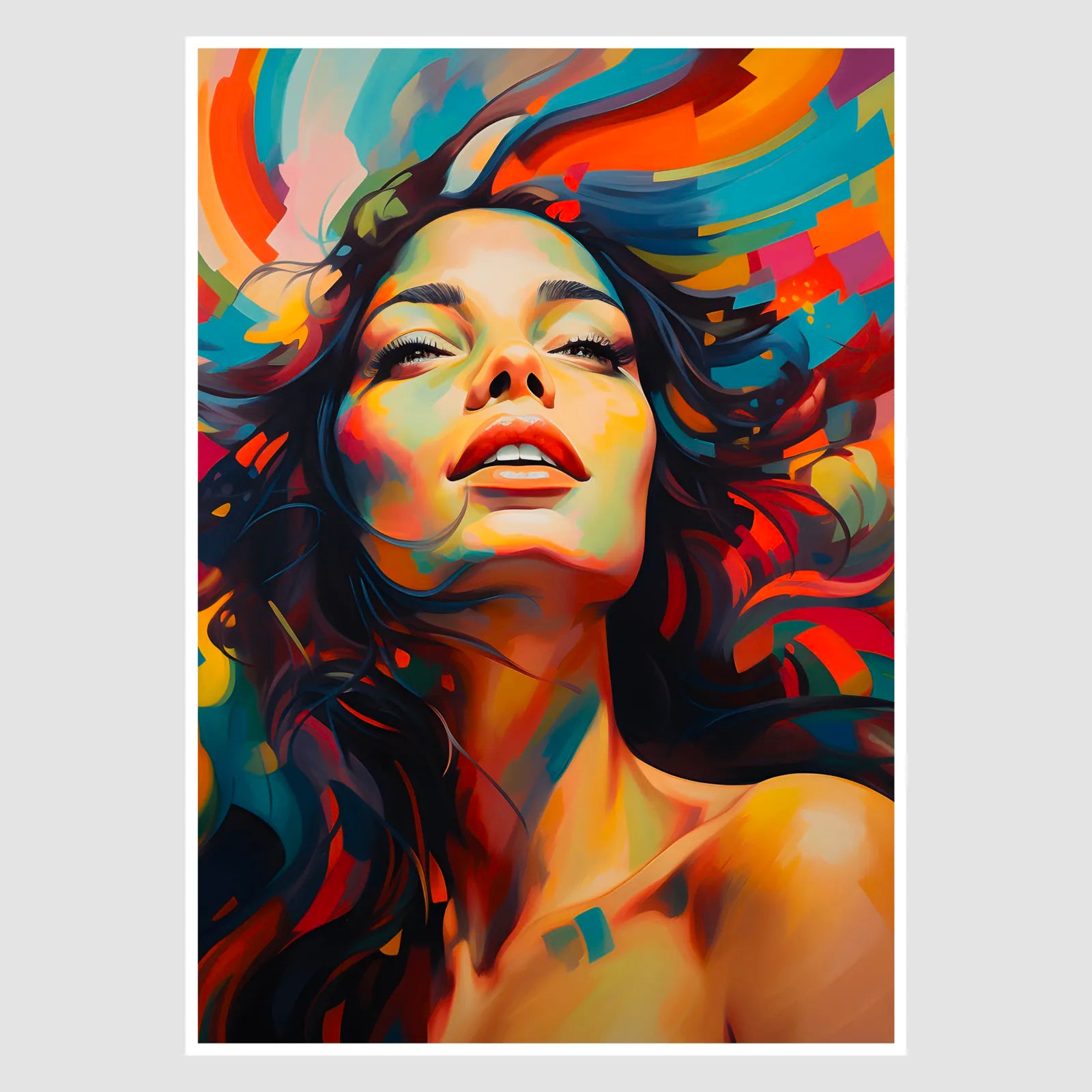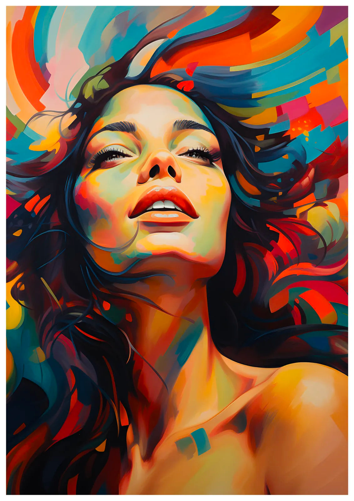 This stunning art print features a woman facing forward and slightly upwards, her gaze captivating with slightly open hazel eyes that exude a sense of wonder and allure. Her hair appears to be blowing in the wind, creatively represented by vibrant splashes of colour that add movement and energy to the composition. The bold, bright hues create a striking contrast, enhancing the overall visual impact of the piece. This dynamic artwork captures the essence of freedom and expression, making it an ideal statement piece for any space. Perfect for those who appreciate modern artistry, this print can be paired with complementary works to create a beautiful gallery display.