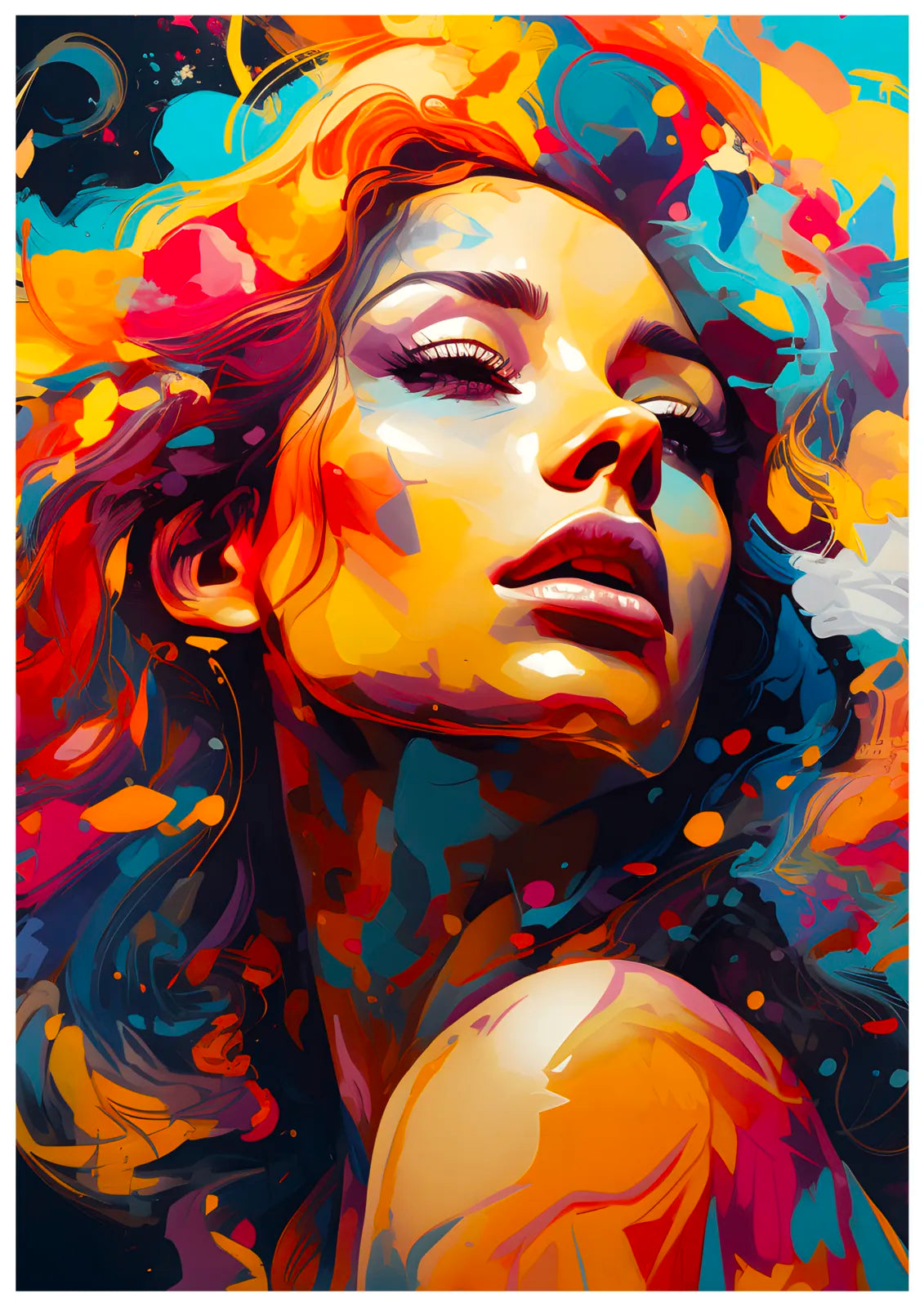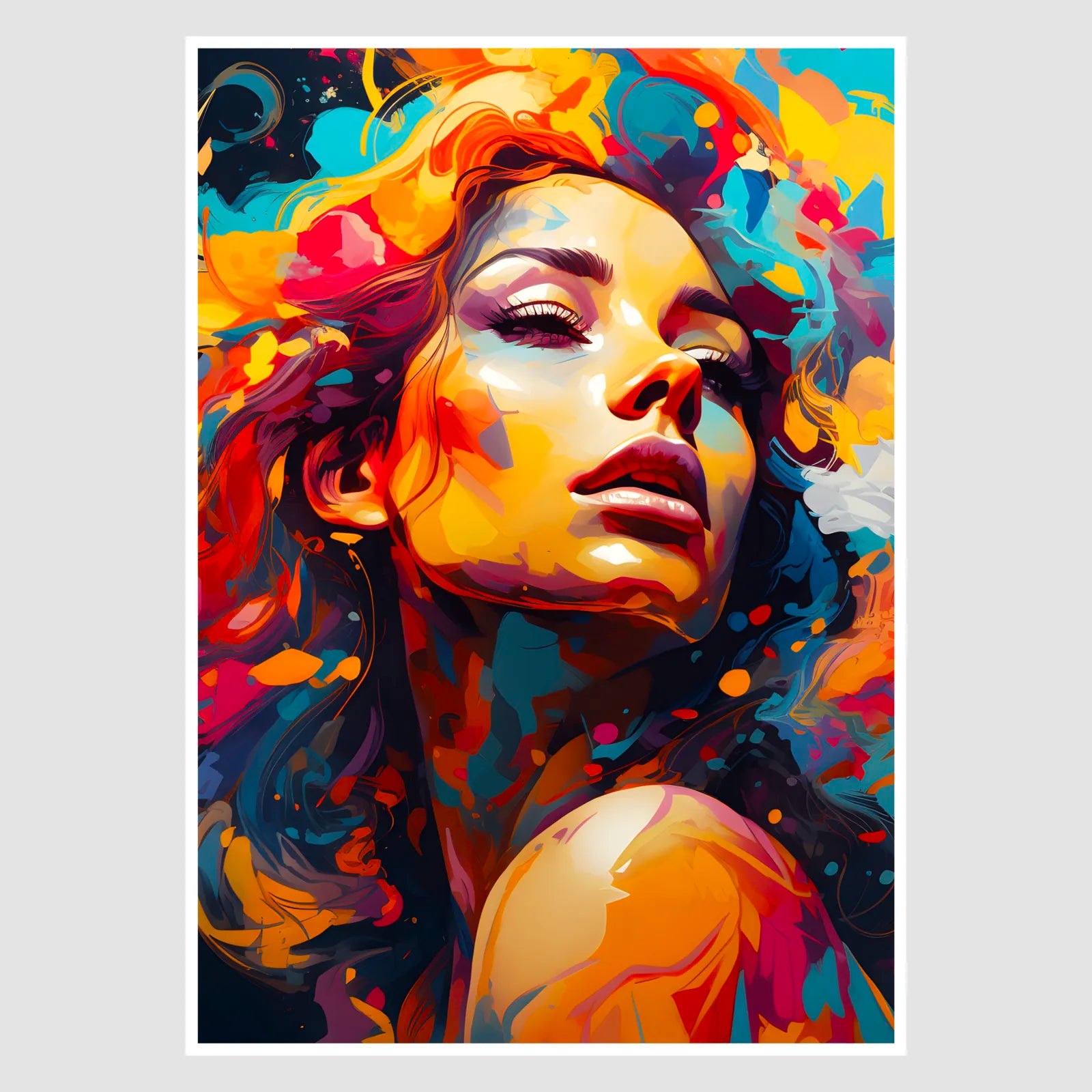 This striking art print features a woman’s face in a slightly side profile, adorned with vibrant graffiti-style paint splashes and swirling colours that form her hair. The bold, bright hues create a dynamic and energetic effect, enhancing the captivating allure of her gaze. With a sexy and confident expression, she exudes a sense of modern elegance. The combination of expressive paint splashes and the bold colour palette gives this piece a contemporary, urban feel, making it an eye-catching statement for any space. Perfect for art lovers seeking to add a touch of bold creativity, this print can be paired with complementary pieces for a stunning visual impact.